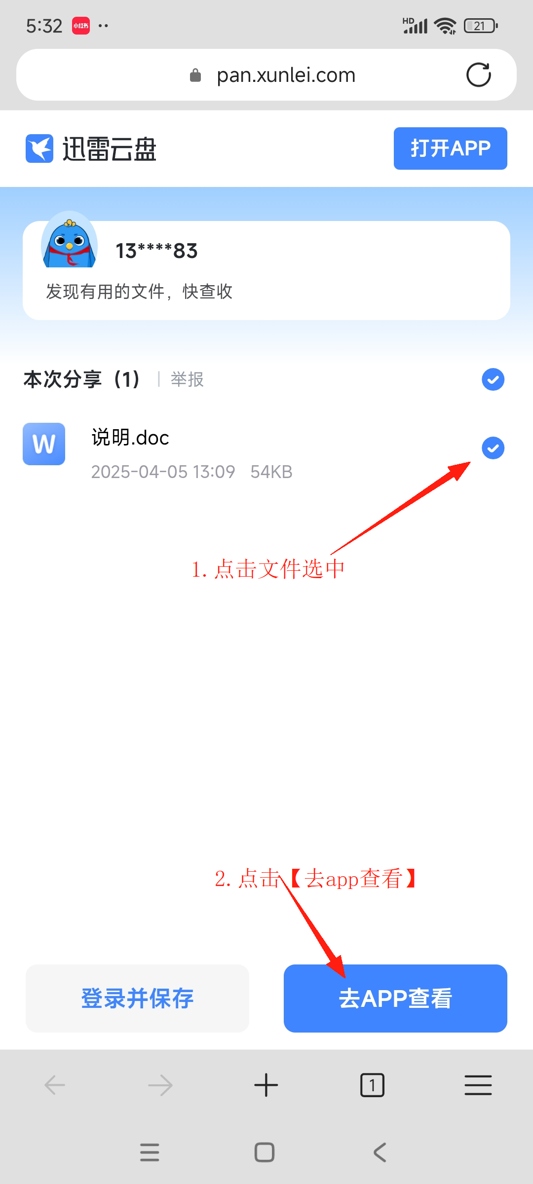 打开页面后选中网盘中的文件并选择【去APP查看】