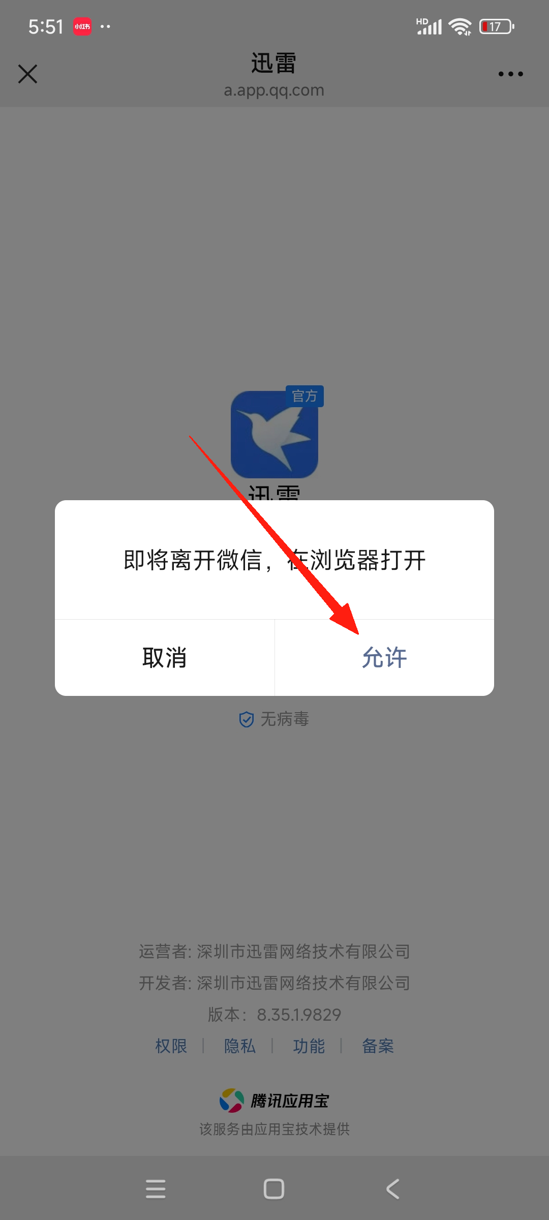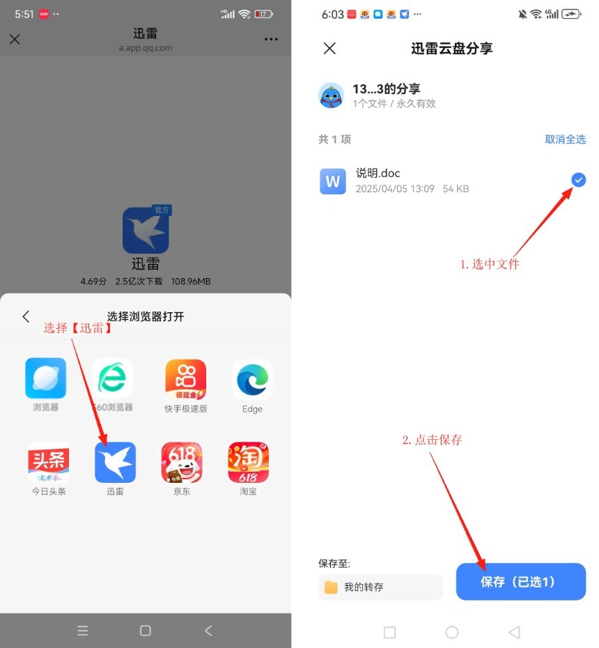 在弹窗中选择【迅雷】并在新页面中将文件保存后下载到手机